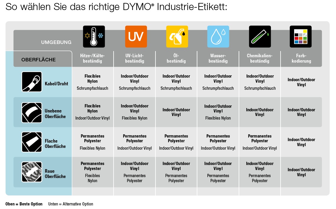 Für unterschiedliche Anwendungen wurden unterschiedliche Bänder entwickelt. In der folgenden Übersicht können Sie feststellen, welches Rhino™-Schriftband für Ihre Aufgabe geeignet sein könnte.